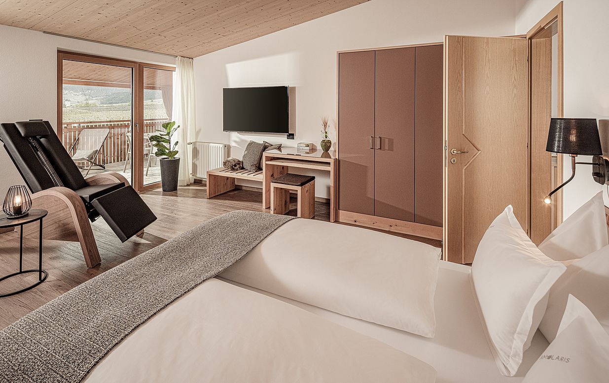 “Mulino” is located on the second floor, boasts a balcony and two infrared loungers.